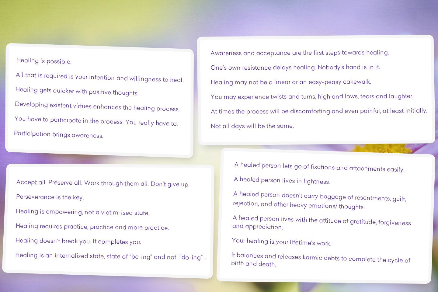 Healing can begin with thoughts. Thoughts are the source- field of wellness or illness. I believe that we create our lives through our thoughts and through the choices we make via our thoughts. There is a relationship between the quality of our thoughts and our physical and emotional health. And vice versa. The power of prana or the cosmic breath is the healing link between the two. Healing is a combination of physical, emotional, mental and spiritual aspects, not just one aspect.